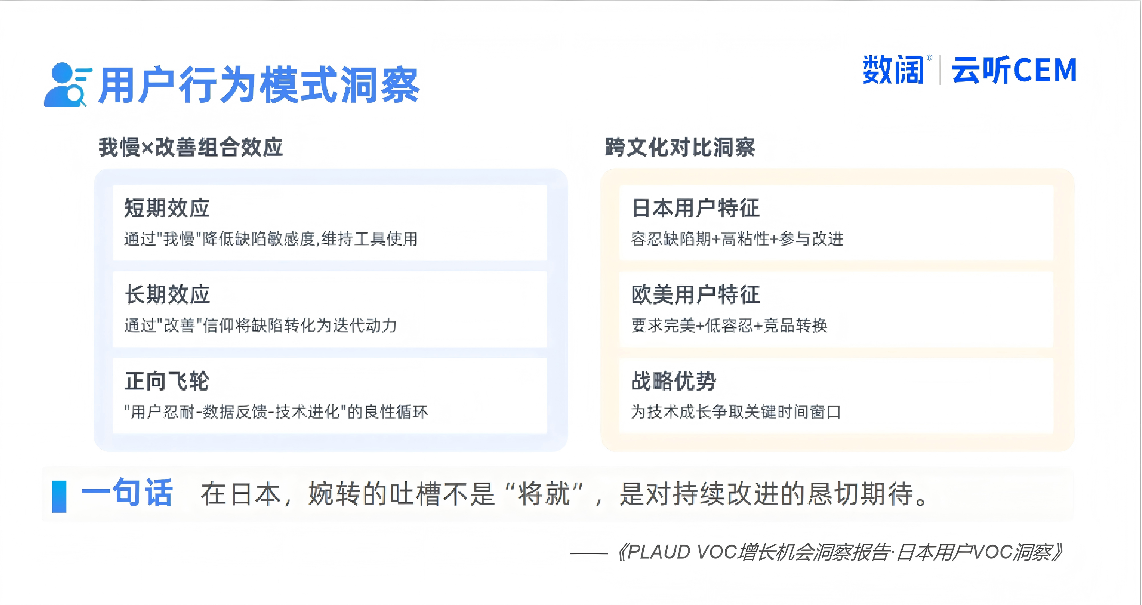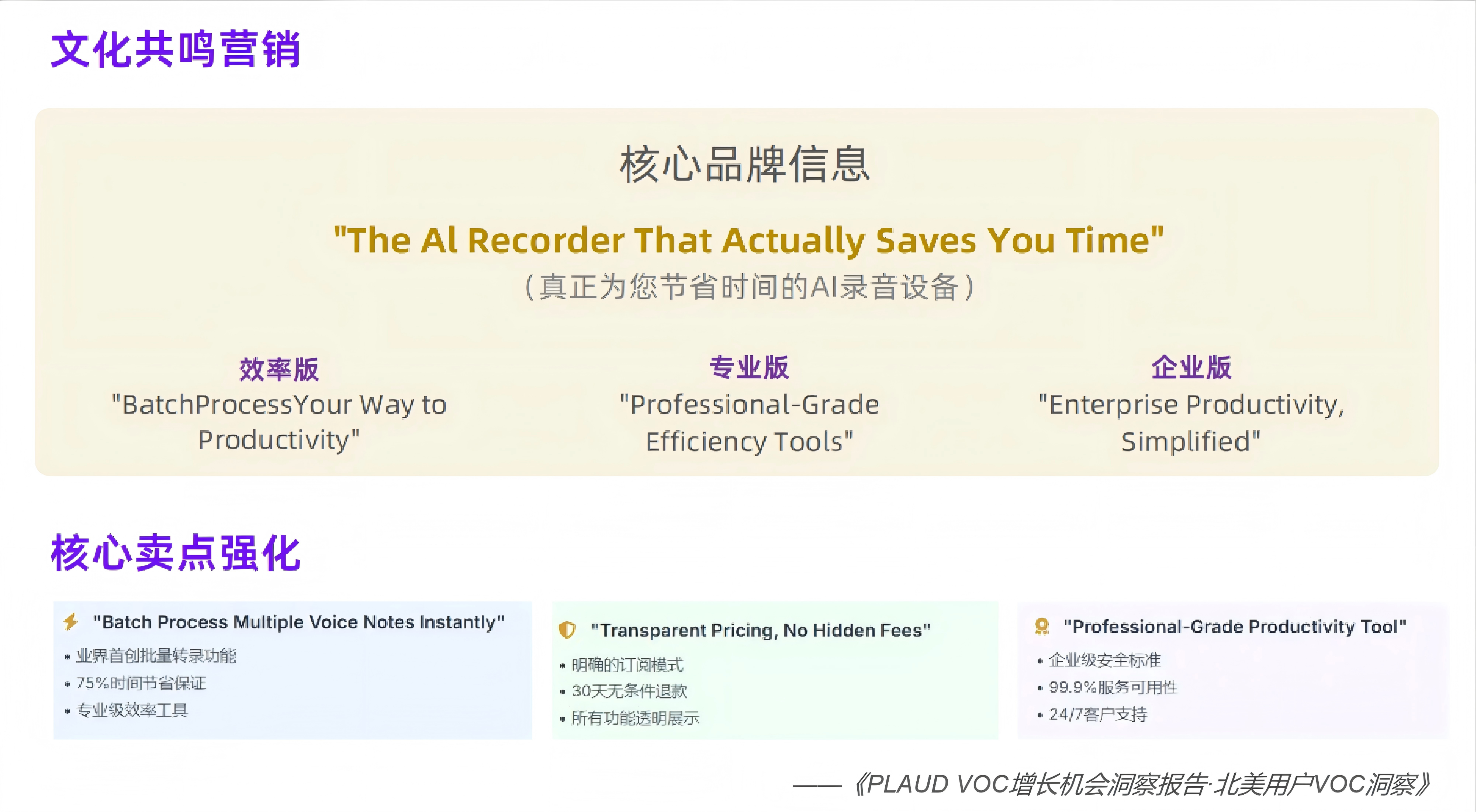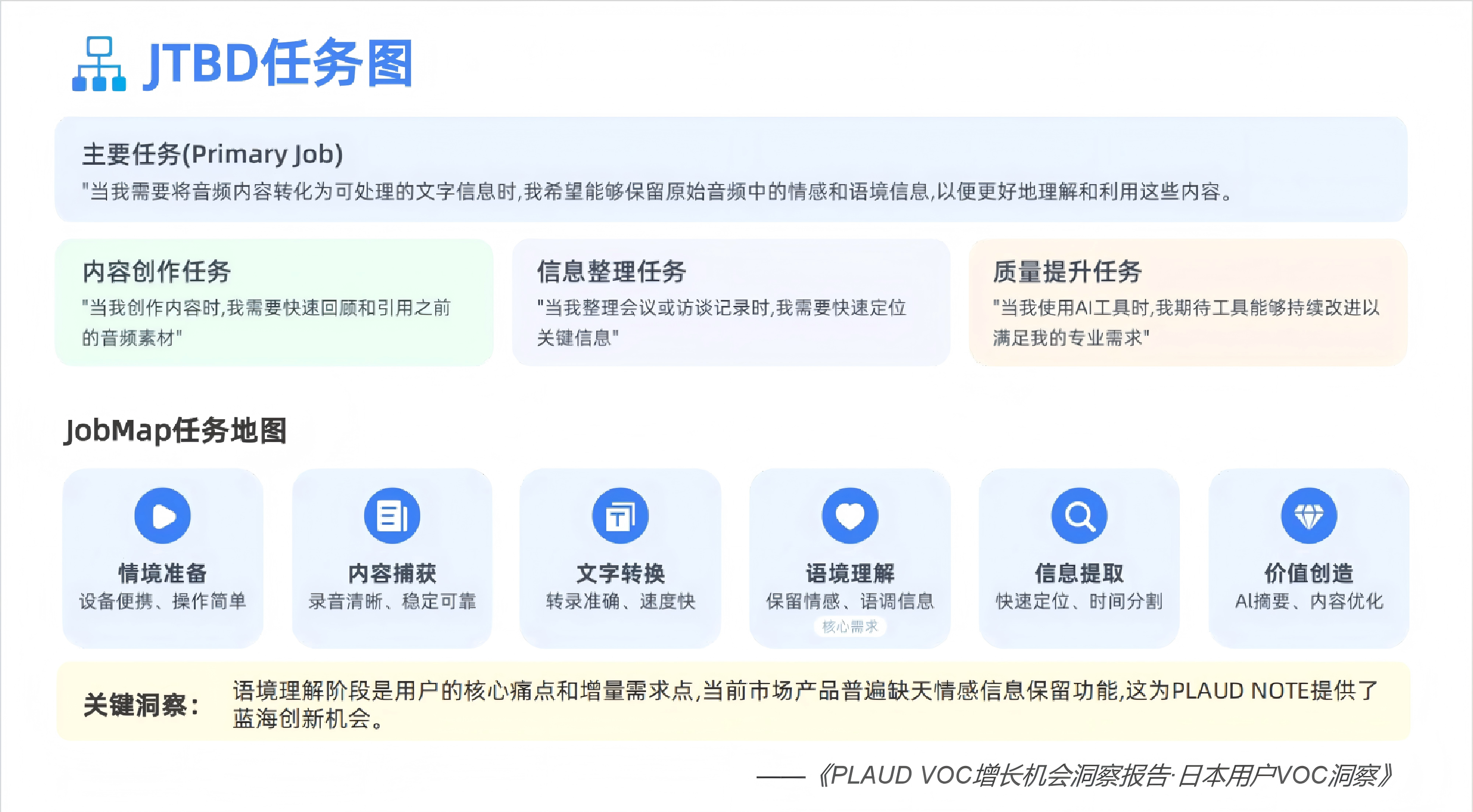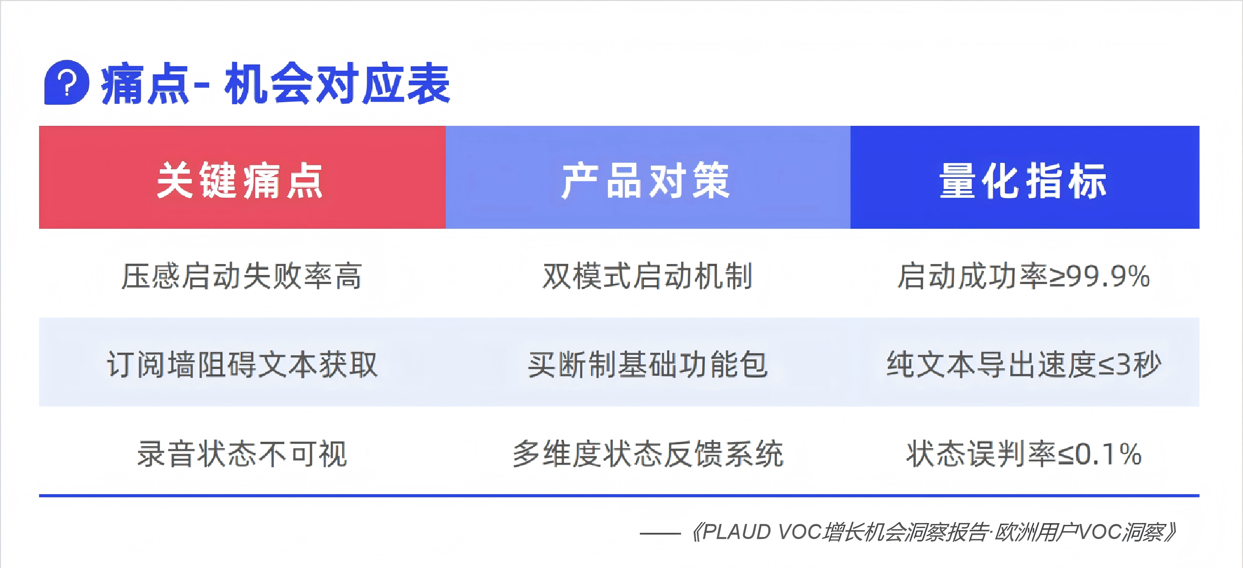 PLAUD的逆襲絕非偶然—— 核心秘訣就是以用戶為中心,深耕場(chǎng)景體驗(yàn)。但即便是這樣的優(yōu)等生,也藏著 “進(jìn)階空間”:美國(guó)用戶盼著批量處理更高效,日本用戶想要錄音帶點(diǎn) “情緒溫度”,德國(guó)用戶執(zhí)著于啟動(dòng)零失誤。讓我們基于下面這份近萬(wàn)條用戶反饋的《PLAUD VOC增長(zhǎng)機(jī)會(huì)洞察報(bào)告》,來(lái)看看如何抓住海外用戶的真需求,把VOC(客戶之聲)數(shù)據(jù)轉(zhuǎn)化為“持續(xù)增長(zhǎng)燃料”。