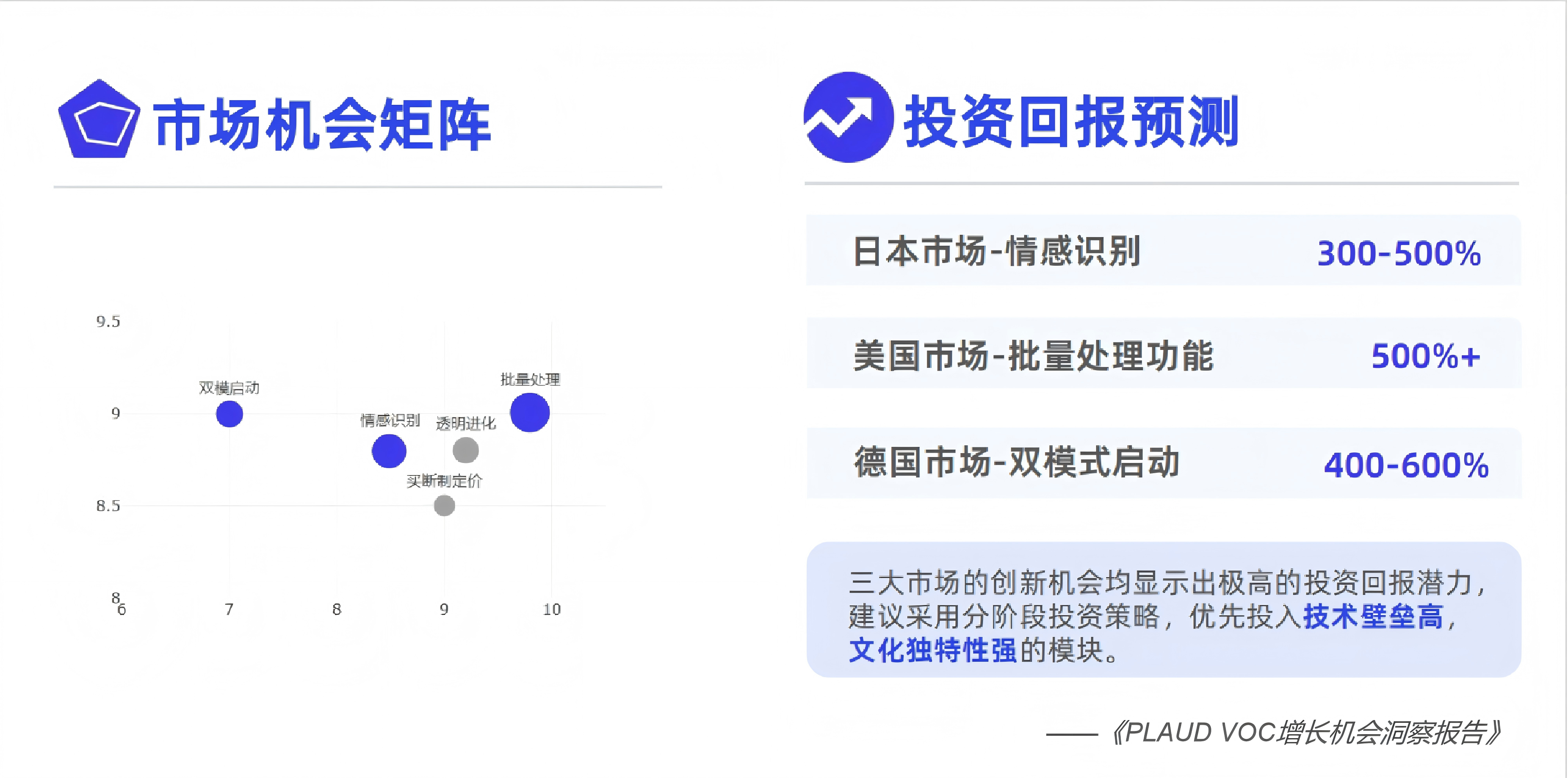 第一階段聚焦高需求緊迫度的核心場(chǎng)景,快速占領(lǐng)市場(chǎng)。美國(guó)的批量語(yǔ)音轉(zhuǎn)錄處理(投資回報(bào)預(yù)測(cè)500%+)和德國(guó)的雙模式啟動(dòng)(400-600%),均具備“高需求強(qiáng)度+高技術(shù)可行性”的特點(diǎn),可作為優(yōu)先投入方向;第二階段優(yōu)化情感與增值功能,如日本的透明進(jìn)化機(jī)制與多模態(tài)摘要系統(tǒng),提升用戶忠誠(chéng)度;第三階段則可根據(jù)VOC(客戶之聲)動(dòng)態(tài)反饋擴(kuò)展功能,如美國(guó)市場(chǎng)的效率對(duì)比量化展示,德國(guó)市場(chǎng)的全天候續(xù)航升級(jí)等。