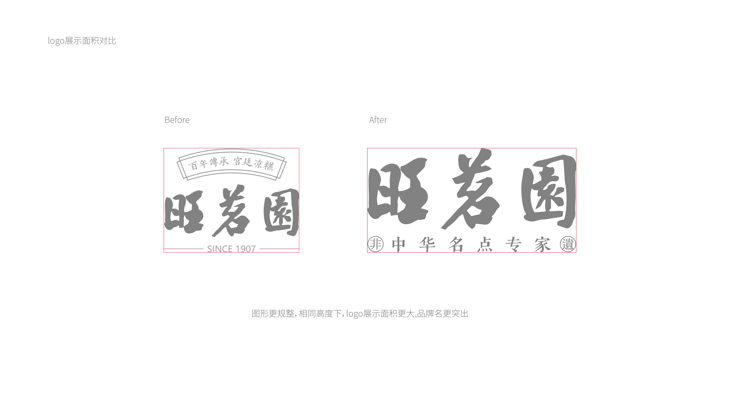 旺茗園的logo升級(jí)并非顛覆式創(chuàng)新,而是基于百年傳承資產(chǎn)的優(yōu)化重構(gòu),核心解決“與定位強(qiáng)綁定”的問(wèn)題。升級(jí)后的logo突出“旺茗園=中華名點(diǎn)專(zhuān)家”的核心認(rèn)知,將“旺”的紋樣與文化融入設(shè)計(jì),形成獨(dú)特的記憶符號(hào)與文化內(nèi)核。設(shè)計(jì)上,圖形部分更規(guī)整,在相同展示高度下,品牌名更突出,提升識(shí)別效率。