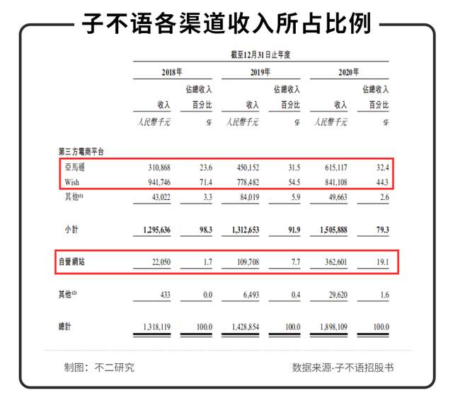 據(jù)子不語招股書顯示,其收入來源按銷售渠道劃分,主要分為第三方電商平臺和自營網(wǎng)站(以及其他)。2018~2020年,來自第三方電商平臺的收入分別占比98.3%、91.9%和79.3%。