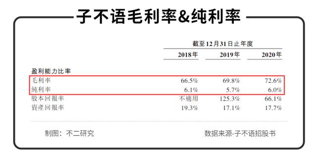 再看子不語的毛利,2018~2020年分別為8.76億元、9.98億元、13.78億元,毛利率66.5%、69.8%、72.6%,年復合增速為19.37%。