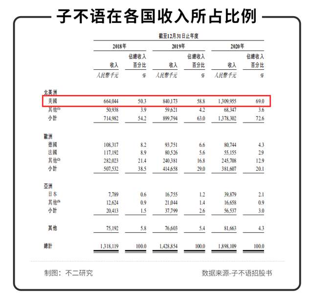 從地區(qū)上來看,子不語產(chǎn)品銷售全球超過80%的國家及地區(qū)的終端客戶,但從招股書觀察,其主要培養(yǎng)的還是歐美市場,以美國為重中之重。