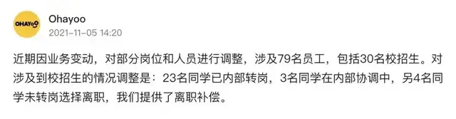 字節(jié)跳動旗下休閑游戲發(fā)行與自研平臺 Ohayoo的部分員工,自2021年 10 月 15 日起陸續(xù)收到通知,被要求在未來一個月內(nèi)離職或進行內(nèi)部轉(zhuǎn)崗。人員調(diào)整涉及 79 人,包括 30 名校招生。Ohayoo 表示,“對涉及到校招生的情況調(diào)整是:23名同學(xué)已內(nèi)部轉(zhuǎn)崗,3名同學(xué)在內(nèi)部協(xié)調(diào)中,另4名同學(xué)未轉(zhuǎn)崗選擇離職,我們提供了離職補償”。