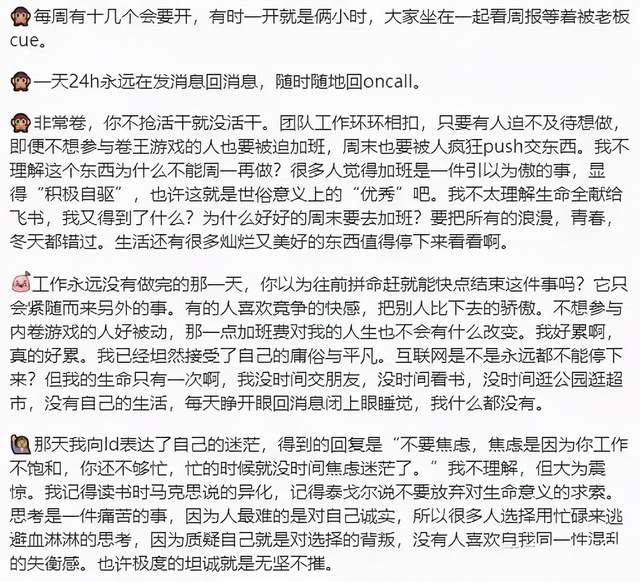 在某社交平臺,曾有大廠員工稱,每周有十幾個會要開,一天24h隨時隨地oncall,工作就是一場卷王游戲,只要有人迫不及待想做,就要被迫加班,周末也要被人瘋狂push交東西,當想找人交流時,得到的卻是“你工作還不夠飽和,忙起來就沒時間焦慮了。”